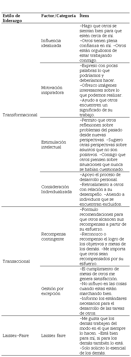 Para la recolección de la información se utilizó un cuestionario online autodirigido, el cual agrupa variables de la institución de afiliación, un perfil de directivo universitario y el MLQ, desarrollado por Bass y Avolio (1992) y adaptado por Northouse (2010). Este instrumento permite medir siete factores o categorías de liderazgo mediante veintiuno ítems que fueron adaptados al contexto universitario. A partir de los factores es posible identificar tres estilos de liderazgo: transformacional, transaccional y laissez faire, como se presenta en la Tabla 1.