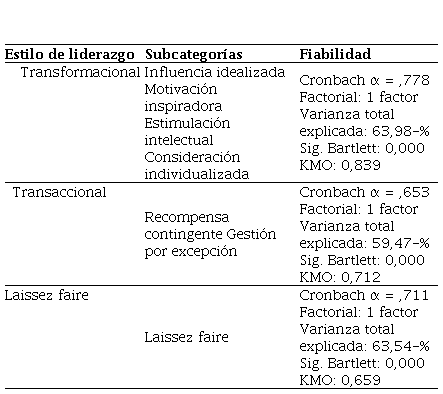 El alfa de Cronbach se empleó para determinar la fiabilidad de los factores del instrumento. Como se presenta en la Tabla 2, se obtuvieron valores mayores a 0,60 para los tres tipos de liderazgo. De acuerdo con Quero Virla (2010), los resultados del alfa de Cronbach superiores a 0,60 son aceptables para propósitos exploratorios y aceptables para fines confirmatorios cuando son superiores a 0,70. Adicional a ello, con relación a la validez, se realizó un análisis factorial que sugiere que tanto las cargas factoriales (>50%) como el coeficiente KMO (> 0,5) y la prueba de esfericidad de Bartlett (p<0,01) arrojan resultados positivos para validar el instrumento.