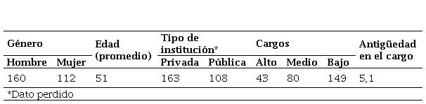 Se estableció para el estudio un muestreo por conveniencia y de bola de nieve. Este tipo de muestreo no es probabilístico y se caracteriza por seleccionar a los participantes que pueden ser accesibles para la investigación. Por otro lado, con la técnica de bola de nieve, se puede incluir a los participantes que son difícil de encontrar, ya que los que han accedido a la investigación comparten con otros la información del estudio para también participar, aprovechando el espectro virtual como medio para la participación (Baltar y Gorjup, 2012; Otzen y Manterola, 2017). Al estudio aceptaron participar 272 directivos universitarios. Como criterios de inclusión del estudio, se tuvo en cuenta que los participantes estuvieran ocupando algún cargo directivo durante el momento de la recolección de la información.