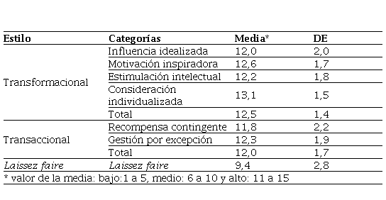 Fuente: elaboración propia.Table 4. Leadership style scores at Colombian universities