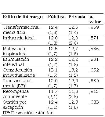 De acuerdo con el tipo de institución, tanto en las universidades públicas (M=12,4; DE=1,3) como privadas (M=12,5; DE=1,4), se ejerce principalmente el liderazgo transformacional (ver Tabla 6). No se encontraron diferencias estadísticamente significativas entre ambos grupos (p>0,05).