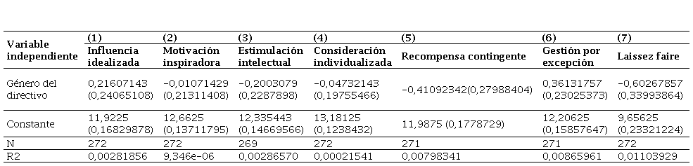 Para este análisis se tuvo como variables dependientes los estilos de liderazgo (1) Transformacional, (2) Transaccional y (3) Laissez faire, y las categorías de los estilos de liderazgo: (1) Influencia idealizada, (2) Motivación inspiradora, (3) Estimulación intelectual, (4) Consideración individualizada, (5) Recompensa contingente, (6) Gestión por excepción, y (7) Laissez faire. Como variables independientes el género del directivo, el tipo de institución (variables dummys) y antigüedad en el cargo (variables métricas).