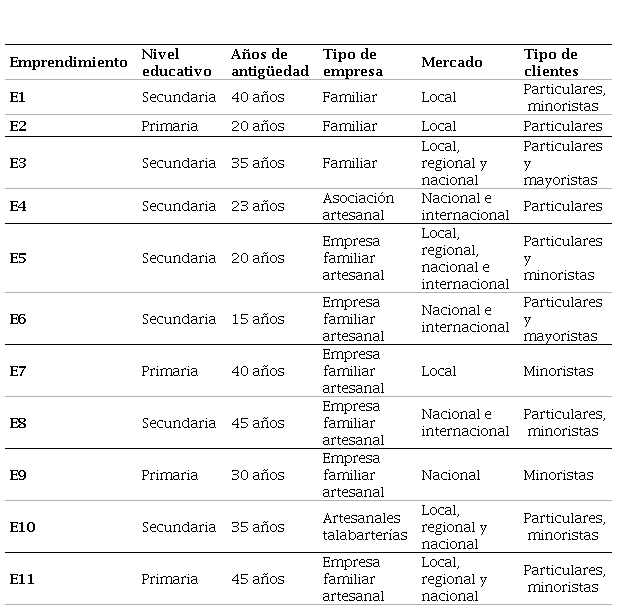 La participación estuvo conformada por las microempresarias del sector artesanal del departamento de Sucre (Morroa, Sampúes, San Onofre y Sincelejo), municipios donde se presenta la mayor actividad artesanal; además, se encuentran registrados en el SIEAA. Conforme al DANE (2020a), la población artesanal del departamento de Sucre está constituida por 389 artesanos (talla en madera, tejeduría – hilo acrílico y tejidos en caña flecha), de los cuales, el 61% lo conforman mujeres y 39% hombres. Es de señalar, que en la investigación, en la etapa de contacto e información para la obtención de la base de datos de las artesanas, se pudo establecer que la población femenina al frente de los emprendimientos disminuyó como consecuencia de problemas de la edad y el COVID-19. Por lo tanto, se realizó una muestra no probabilística por conveniencia a los emprendimientos femeninos artesanales, destacando los siguientes criterios de inclusión: 1. Voluntad manifiesta de participar en el estudio; 2. Práctica artesanal como fuente de ingreso: más de un año de producción artesanal; 3. El propietario debe ser mujer, seleccionando una muestra de once artesanas que cumplieron con los criterios (ver Tabla 1). Es de aclarar que el no cumplimento de los criterios antes mencionados se asumió como condición de exclusión.