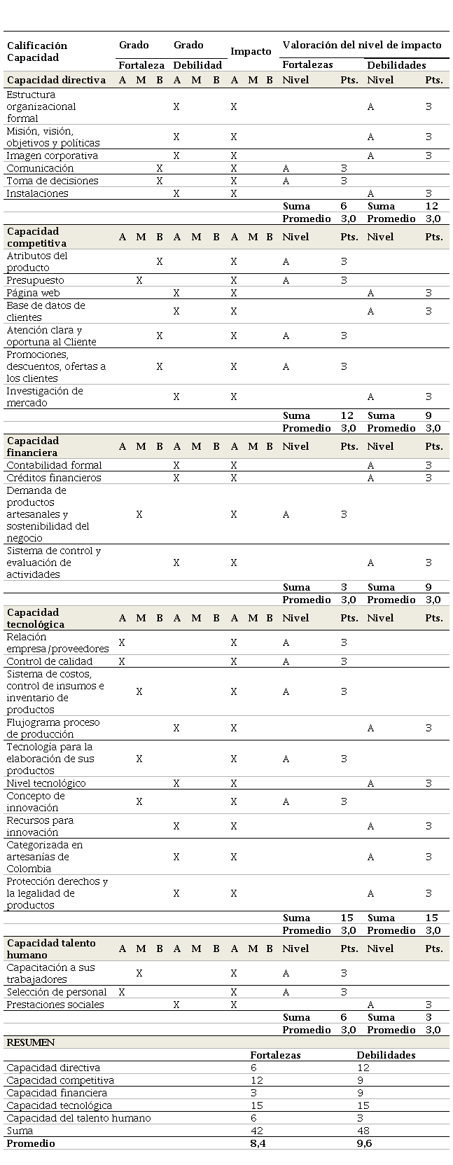 El cual permite aplicar el 20/80, es decir, encontrar el 20% de los factores que explican el 80% de las debilidades o fortalezas de la empresa artesanal; además, los factores fueron valorados en una escala Alto (A), Medio (M) y Bajo (B); de igual modo, el nivel de impacto de cada fortaleza, debilidad, amenaza y oportunidad (Serna Gómez, 2014, p. 175).