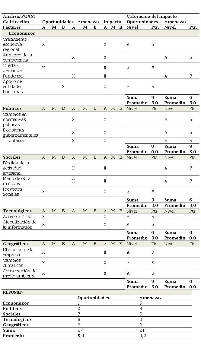 Por su parte, la Tabla 6 evidencia el análisis POAM, las oportunidades y amenazas que son factores externos e inciden de manera directa en el crecimiento organizacional de los emprendimientos femeninos del sector artesanal del departamento de Sucre. Con un total de 27 puntos, se identifica una calificación alta en las oportunidades. Los factores económicos precisan que la situación del país ha afectado a las empresas artesanas en aspectos como el crecimiento económico regional, el aumento de la competencia de artículos artesanales, la oferta y demanda de productos artesanales y el impacto por la pandemia de COVID-19, lo que, sumando los créditos bancarios con intereses altos, han dejado estragos y poco crecimiento. En factores políticos, los cambios en normativas políticas, decisiones gubernamentales y tributarias, y la emergencia sanitaria decretada, afectó considerablemente el desempeño de la empresa. Con relación al factor social, se evidenció la facilidad en medio de la emergencia sanitaria de conseguir y vincular personal del entorno; no obstante, se destacó la pérdida de la actividad artesanal, mano de obra mal paga, en donde, además, los proyectos sociales no atendieron las necesidades de las artesanas y sus emprendimientos. El factor tecnología facilitó contar con apoyo y acceso a herramientas tecnológicas. El factor geográfico, por su parte, mostró una preocupación en la elaboración de sus productos, cuidando y preservando el medio ambiente; así mismo, las artesanas cuentan con condiciones ambientales, climáticas y calidad de vías para la venta de productos; en este punto se destacan la ubicación de la empresa, los cambios climáticos y la conservación del medio ambiente en un alto nivel de oportunidad e impacto.
