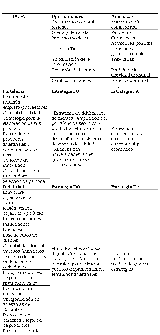 Fuente: elaboración propia a partir de Serna Gómez (2014).De esta manera, para cumplir con los objetivos organizacionales, se deben identificar fortalezas, debilidades, oportunidades y amenazas (Hosseini et al., 2021); en otras palabras, brindar un diagnóstico claro de la empresa para tomar decisiones estratégicas pertinentes y progresar en el futuro (Castillo-Ruano y Banguera-Rojas, 2018). Gracias a la encuesta aplicada y al análisis de resultados cualitativos, se procedió a recopilar los factores con mayor incidencia en los emprendimientos artesanales femeninos y plasmarlo en una matriz DOFA (ver Tabla 7), donde se presentan las amenazas, oportunidades, fortalezas y debilidades. Con el cruce de estos elementos, se identifican las estrategias FO, FA, DO, DA para mitigar los aspectos negativos y aumentar o fortalecer los positivos.
