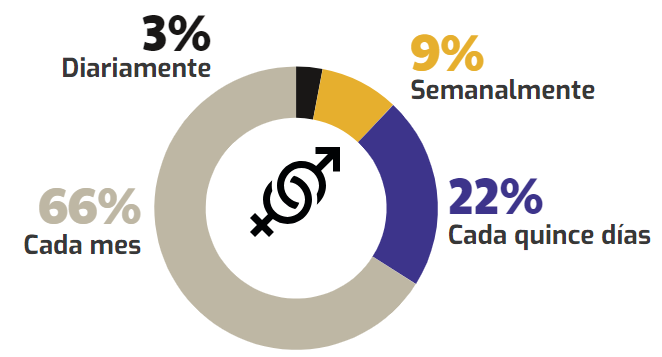Fuente: elaboración propia.La mayoría de los usuarios utilizaba los canales digitales para la compra de productos agrícolas frescos una vez al mes, seguido por aquellos que realizaban compras digitales para estos productos cada quince días (Figura 3). Las frecuencias diaria y semanal incluyeron una menor proporción de los usuarios. Estos resultados indican que el uso de los canales digitales para adquirir productos agrícolas frescos se da con mayor frecuencia en intervalos más largos, hecho que debiera contemplarse en el diseño de estrategias de promoción y logística de entrega de los productos.