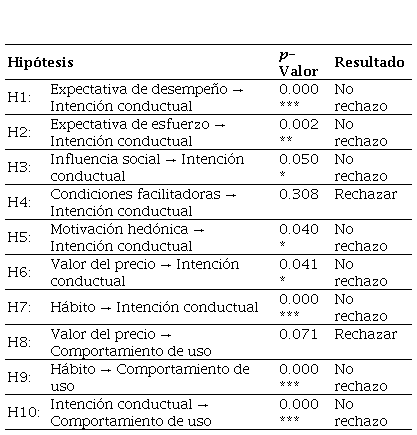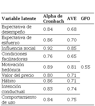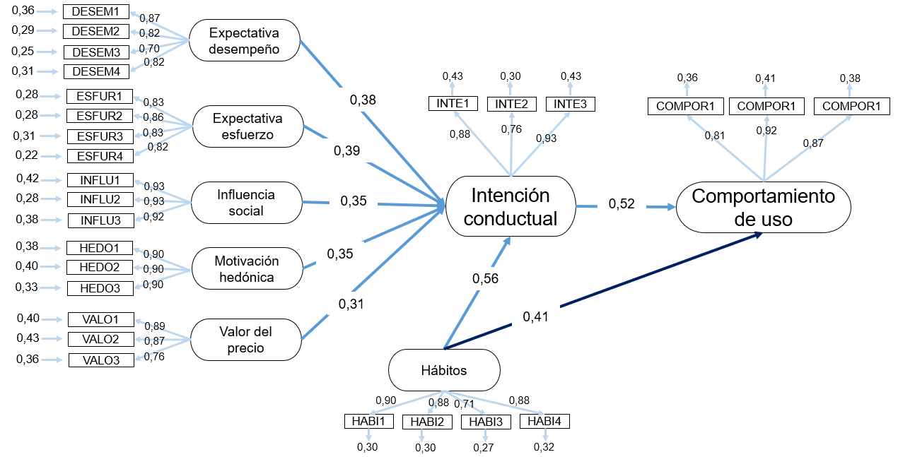 Fuente: elaboración propia con base en Venkatesh et al. (2012).El modelo se evaluó por medio de la consistencia interna, la bondad de ajuste y la validez convergente y discriminante. La consistencia interna se comprobó a partir del alfa de Cronbach con valores superiores a 0,7, lo que indica fiabilidad de cada constructo (Martínez Ávila y Fierro Moreno, 2018; Quero Virla, 2010). La bondad de ajuste se determinó con el índice GoF (Goodness of Fit), con valores superiores a 0,5, lo que demuestra un buen ajuste del modelo de medición y la estructura de los datos (Akter et al., 2011; Navimipour et al., 2018). La varianza media extraída (AVE) estableció la validez convergente con valores superiores a 0,5, que sugiere que cada variable latente es explicada por lo menos por el 50% de las variables observables (Gálvez-Ruiz et al., 2017). La validez discriminante fue determinada a partir de la diferencia entre la raíz cuadrada de la AVE y la varianza compartida entre variables latentes, con el fin de evaluar en qué medida difieren entre sí las variables latentes del modelo (Martínez-García y Martínez-Caro, 2009). Los datos fueron analizados en el software R (R Core Team, 2020), con la librería plspm (Sanchez y Trinchera, 2010).