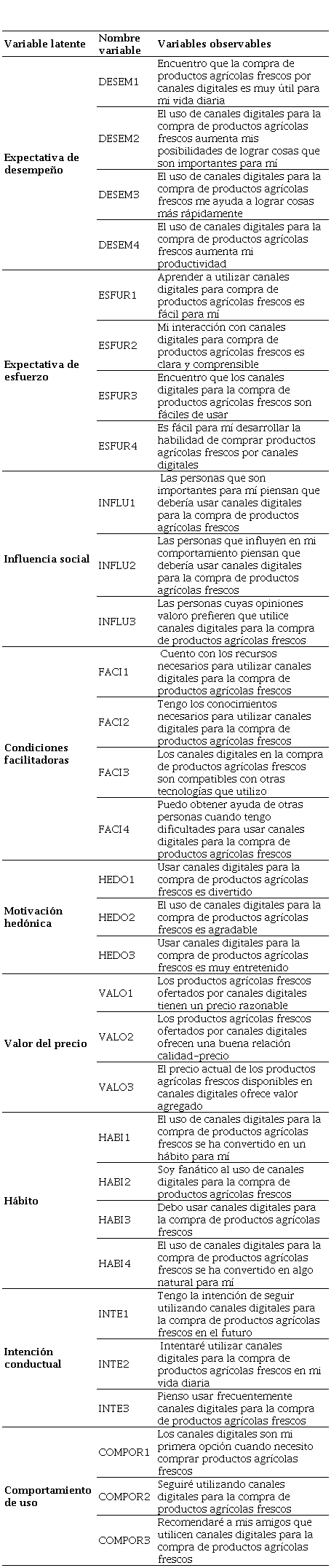 Fuente: elaboración propia con base en Venkatesh et al. (2012).Table 1. Variables employed to identify the factors influencing the use of digital channels for purchasing fresh