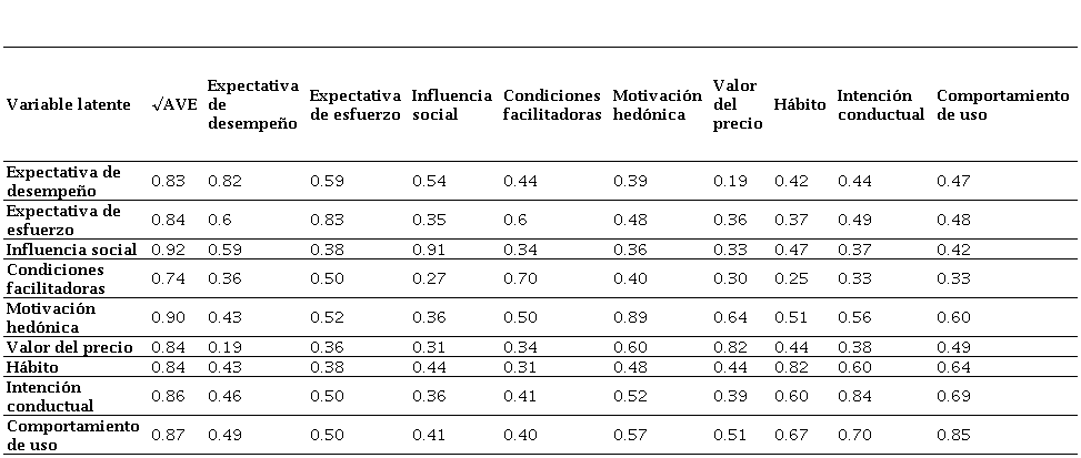 Fuente: elaboración propia.Table 3. Average variance extracted and shared variance of the UTAUT2 model for investigating consumers’ online purchase of fresh agricultural products