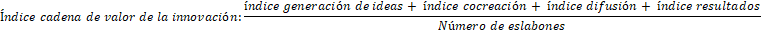Para obtener tanto los índices por cada eslabón como el índice global (cadena de valor de la innovación) se utilizaron promedios simples dado la distribución homogénea de pesos.