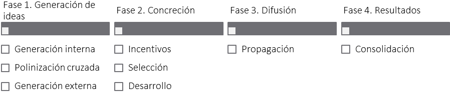 Fuente: elaboración propia.La fase inicial de generación de ideas tiene lugar en el ámbito interno de la empresa y se origina mediante la colaboración entre diversas áreas internas, o puede surgir externamente a través de contribuciones ajenas a la compañía. Por lo tanto, se desprenden tres subfases denominadas generación interna de ideas, polinización cruzada y generación externa. En la segunda etapa, conocida como concreción, se lleva a cabo la selección o filtrado de las ideas concebidas en la primera fase. En esta etapa, se evalúa y planifica su financiamiento, que abarca desde su desarrollo hasta su conversión en un producto o servicio destinado a generar ingresos. En la tercera etapa, que es la de difusión de las ideas, se procede a la propagación de los resultados con el propósito de darlos a conocer en el mercado correspondiente. Por último, la fase de resultado o consolidación tiene como objetivo la transformación de la idea en una nueva empresa, ya sea en forma de start-up o mediante el establecimiento de spin-offs.