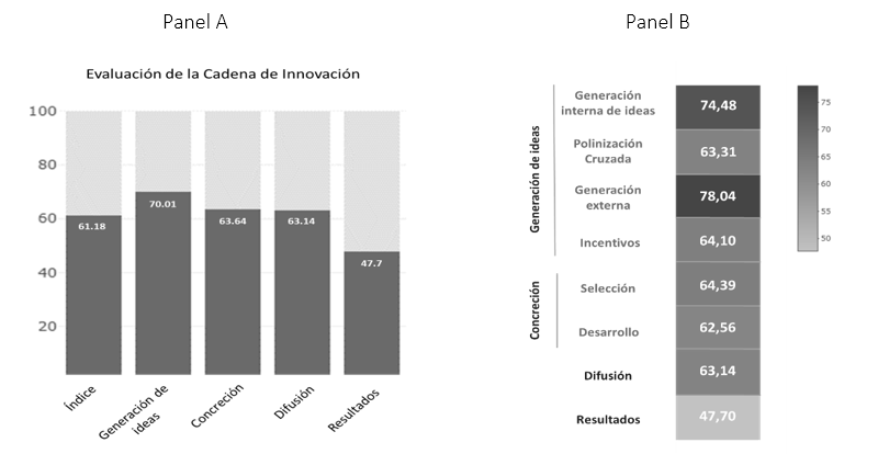 Fuente: elaboración propia.Al desagregar las fases en cada uno de sus componentes, se pudo analizar por separado los puntos más fuertes del ecosistema dentro de la cadena. En el Panel B de la Figura 1, se puede observar que, dentro de la generación de ideas, la principal fortaleza del ecosistema, en promedio, se encuentra en la generación interna y externa de ideas (74.48% y 78.04%, respectivamente). Es decir que las empresas presentan avances tanto en la producción de ideas propias de los trabajadores internos de las empresas como para la apropiación de ideas provenientes de otras empresas u otros sectores. Sin embargo, hay un menor avance dentro de la polinización cruzada (63.31%) asociada a la baja coproducción de ideas entre diferentes áreas de una misma empresa. En términos de la generación de incentivos, se presenta un avance intermedio (64.10%) que se explica, igual que en las fases de la concreción y difusión, por la falta de claridad de los procesos dentro de la creación y ejecución de los productos innovadores o las patentes.