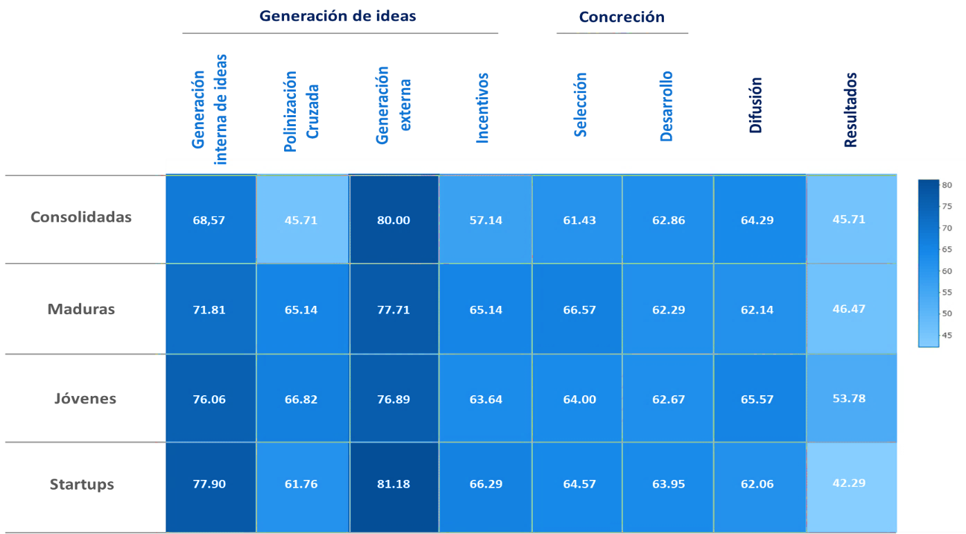 Fuente: elaboración propia.Tal y como lo sugiere la literatura, los start-up presentan un mayor avance dentro del fase de la generación interna de ideas (77.90%) y, a medida que aumenta el grupo de edad de la empresa el subíndice presenta una disminución, de manera que las empresas consolidadas presentan el menor avance en este subíndice (68.57%). Por otra parte, tanto las empresas consolidadas como los start-up presentan un alto grado de avance dentro del subíndice de la generación externa (80% y 81.18%, respectivamente). Con relación a los subíndices de desarrollo y selección, no se presentan grandes diferencias entre los distintos grupos de edad de las empresas, principalmente en el subíndice de desarrollo de la idea. En cuanto al avance de la difusión de la idea, son las empresas jóvenes y las consolidadas las que presentan el mayor avance en términos de este subíndice (65.57% y 64.29%, respectivamente). No obstante, contrario a los resultados esperados, en el subíndice de resultados son las empresas jóvenes, y no las consolidadas, las que presentan el mayor avance dentro de esta fase de la cadena de valor (53.78%).