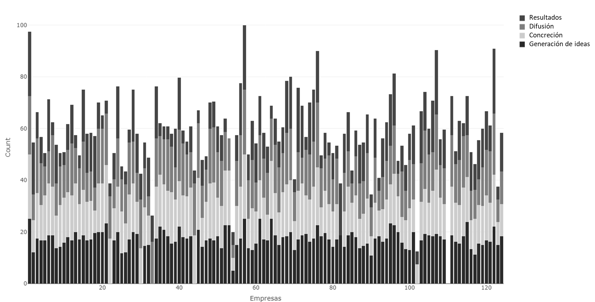 Fuente: elaboración propia.El resultado del índice sintético es un valor que oscila entre 0 y 100 para cada empresa. Donde 100 es el máximo valor o puntaje alcanzado por la empresa, que indica una cadena de valor de innovación exitosa. Estos resultados se analizarán por fase y componente, así como por cada empresa, y a su vez, del total de empresas evaluadas que representan el ecosistema digital.