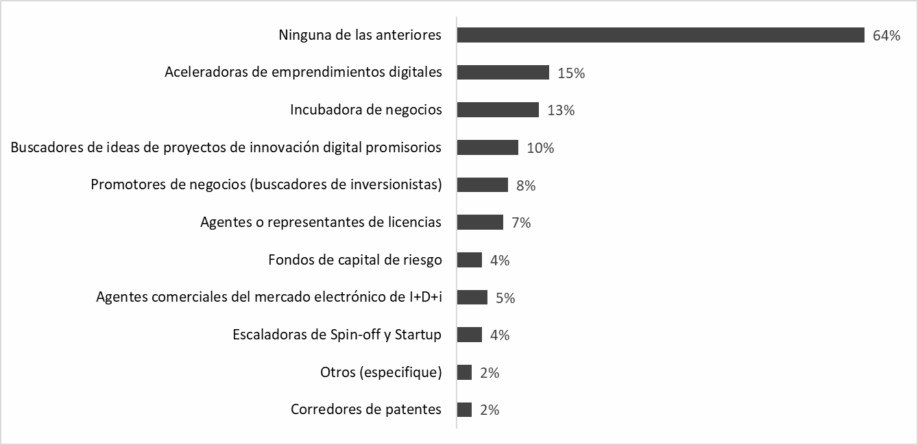 Entre las empresas digitales analizadas hay una desconexión con las instituciones de apoyo. De acuerdo con los hallazgos, menos del 20% de las empresas tienen relación con redes, y muy pocas se relacionan de manera directa, por ejemplo, con MinTic, las cámaras de comercio, con universidades y otros centros académicos. Esto se complementa con el análisis de los agentes que contribuyen a estructurar el mercado de la innovación digital. Se encontró una muy baja o casi nula presencia de agentes o intermediarios que permiten dinamizar la innovación desde fuera de las empresas, ya sea para buscar ideas o patentes relativamente desarrolladas o no, y para su inversión y comercialización. En otras palabras, los gerentes encuestados no conocen estos actores o se encuentran desconectados de socios estratégicos, como es el caso de inversionistas, promotores, representantes comerciales y demás agentes dinamizadores del desarrollo del sector. El 64% de las empresas no ha tenido contacto con ningún agente de innovación, y únicamente el 15% ha buscado aceleradoras de emprendimientos digitales, 13% incubadoras de negocios, el 10% buscadoras de ideas, y menos del 9% promotores de negocios, agentes de licencias, fondos de capital, agentes comerciales del mercado electrónico, escaladoras y corredores de patentes (ver Figura 5).
