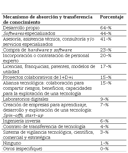 Fuente: elaboración propia.En primer lugar, se encontró que, al analizar las prácticas colaborativas de las empresas, estas utilizan como medios para adquirir su conocimiento, su propia experiencia a través de sus propios desarrollos (64%), incorporando software especializados (44%) y mediante asistencia técnica (asesorías y consultorías). La quinta parte contrata personal experto y recurre a licencias y a la compra de hardware y software.