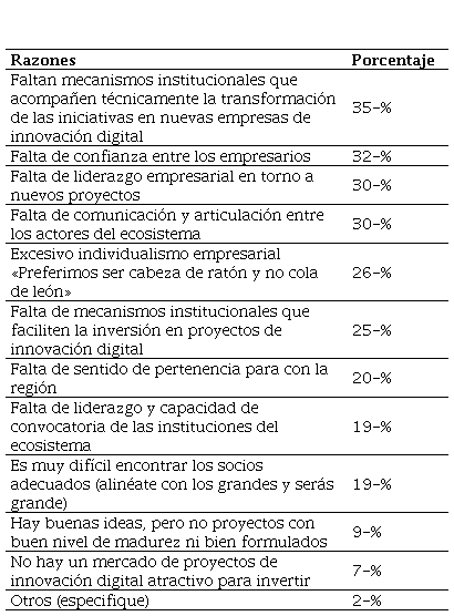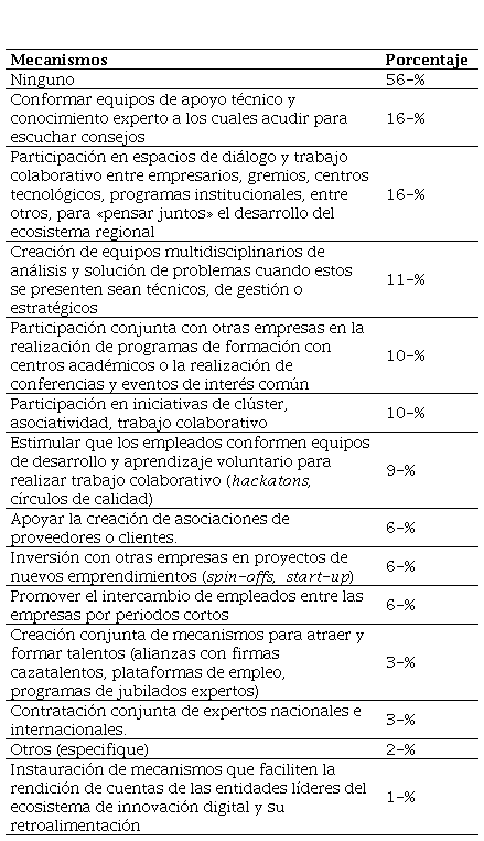 Fuente: elaboración propia.Los gerentes perciben que no existen mayores motivaciones para establecer una relación biunívoca con las instituciones de apoyo. En el mejor de los casos, y de manera puntual, participan en algunos espacios de diálogo o en programas de capacitación (menos del 16% de las empresas). También anotan deficiencias del ecosistema, como falta de liderazgo y capacidad de convocatoria institucional, carencia de comunicación y articulación entre sus actores y reducidos mecanismos institucionales que acompañen efectivamente a las empresas. En cuanto a las razones que tienen las empresas para integrarse en el ecosistema, se encontró entre los principales aspectos la falta de mecanismos institucionales que acompañan técnicamente la transformación de las iniciativas en nuevas empresas de innovación digital, con un 35% de la opinión de los gerentes, la falta de confianza entre empresarios (32%), la falta de liderazgo empresarial entorno a nuevos proyectos, falta de comunicación y articulación entre actores (30%), y excesivo individualismo, con un 30% de las respuestas. Esto denota una estrategia de colaboración baja, que no se encuentra respaldada en la confianza, donde se requiere de normas e incentivos que aseguren la reciprocidad entre actores.
