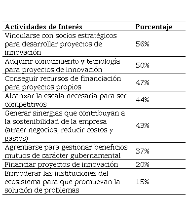 Los gerentes se motivarían a participar en caso de vincularse con socios estratégicos para el desarrollo de proyectos de innovación; la segunda motivación, es adquirir conocimiento y tecnología para proyectos de innovación; y, en tercer lugar, conseguir recursos de financiación. Se revela que las empresas sí están interesadas en vincularse con socios estratégicos y adquirir conocimiento y tecnología para proyectos de innovación, sin embargo, aplican muy pocos mecanismos de colaboración que les permite lograr estos objetivos, puesto que únicamente el 16% han recibido apoyo técnico y participado en espacios de diálogo. Por lo cual, las principales razones son la necesidad de fomentar mecanismos institucionales que acompañen la transformación de ideas en nuevas empresas; en otras palabras, las empresas reconocen sus deficiencias en la cadena de valor de la innovación. También se observa la baja confianza de los empresarios, actitud crucial para promover la colaboración y la generación de expectativas alrededor de situaciones oportunistas e intereses individualistas, donde no hay disposición a compartir riesgos y costos de las soluciones conjuntas.