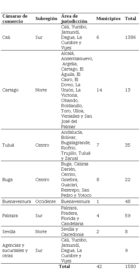 Para la identificación de las empresas en el Valle del Cauca se utilizó el directorio estadístico empresarial del Departamento Administrativo Nacional de Estadística (DANE), utilizando machine learning a partir de los nombres de las empresas de la clasificación CIIU, donde se incluyeron doce actividades completas y veintiocho parciales (Anexo 1), del cual se identificaron 2376 empresas. Esta información fue cruzada con el registro mercantil de las siete cámaras de comercio del departamento, donde se encontraron 1580 empresas renovadas a 2020. La Tabla 1 presenta la distribución de las empresas por cada Cámara y su área de jurisdicción.
