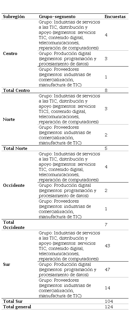 Fuente: elaboración propia.El trabajo de campo se llevó a cabo durante los meses de mayo, junio, julio y agosto de 2021. En la subregión sur, se aplicaron ciento cuatro encuestas: cuarenta y tres en empresas de servicios TIC, cuarenta y siete de producción digital y catorce proveedores. En la zona Pacífico, que representa a Buenaventura, se realizaron siete encuestas, cinco para la zona norte del Valle y ocho en la zona centro.