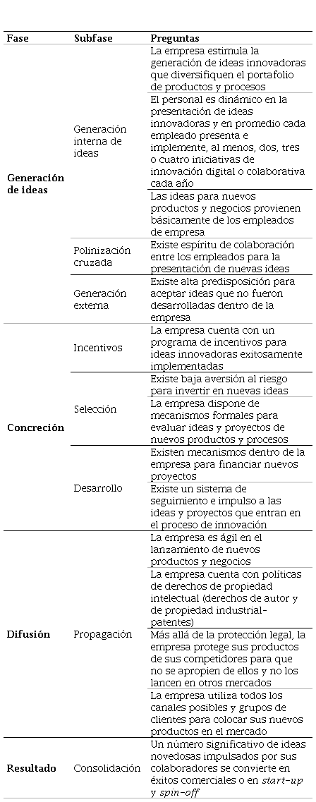 La cadena de valor de la innovación se evaluó con preguntas cerradas, en su mayoría con respuestas predefinidas y en escala de Likert 5, con opciones de respuesta: 1: Totalmente en desacuerdo, 2: En desacuerdo, 3: Parcialmente de acuerdo, 4: De acuerdo, 5: Totalmente de acuerdo. La Tabla 3 contiene las preguntas de la cadena de valor de la innovación basado en el estudio de Hansen y Birkinshaw (2007).