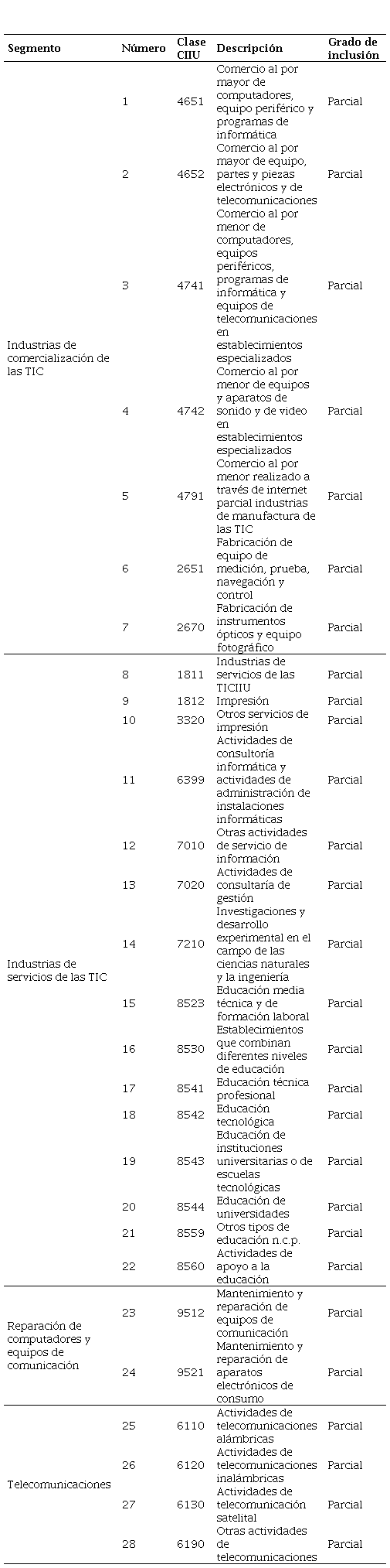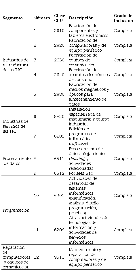 El punto de partida fue la definición de los tipos de empresas pertenecientes a la industria 4.0, para lo cual se tomó como referente el estudio realizado por Confecámaras (2020)3, a partir del cual se realiza la identificación de siete segmentos que representan cuarenta actividades de la Industria 4.0 en Colombia, de acuerdo con la Clasificación Internacional Industrial Uniforme - revisión 4 (CIIU rev4), del que se definieron los segmentos de empresas de: 1. Programación, 2. Procesamiento de datos, 3. Manufactura de las TIC, 4. Comercialización de las TIC, 5. Telecomunicaciones, 6. Industrias de servicios TIC, 7. Reparación de computadores y equipos de telecomunicación, los cuales fueron organizados a su vez en tres grupos: Grupo 1. Empresas de producción digital, Grupo 2. Empresas de servicios TIC, distribución y apoyo, y Grupo 3. Empresas proveedoras.