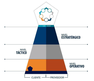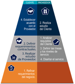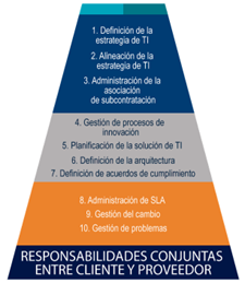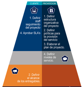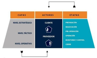 Elaboración propia a partir de Sanguino Reyes (2019).Esta estructura se propone con el fin de administrar la asociación entre cliente y proveedor, y disminuir el impacto de los riesgos que trae consigo (Gewald y Helbig, 2006). El modelo define roles y responsabilidades en todos los niveles de la organización a partir de la gestión conjunta de las relaciones entre el cliente y el proveedor del servicio: