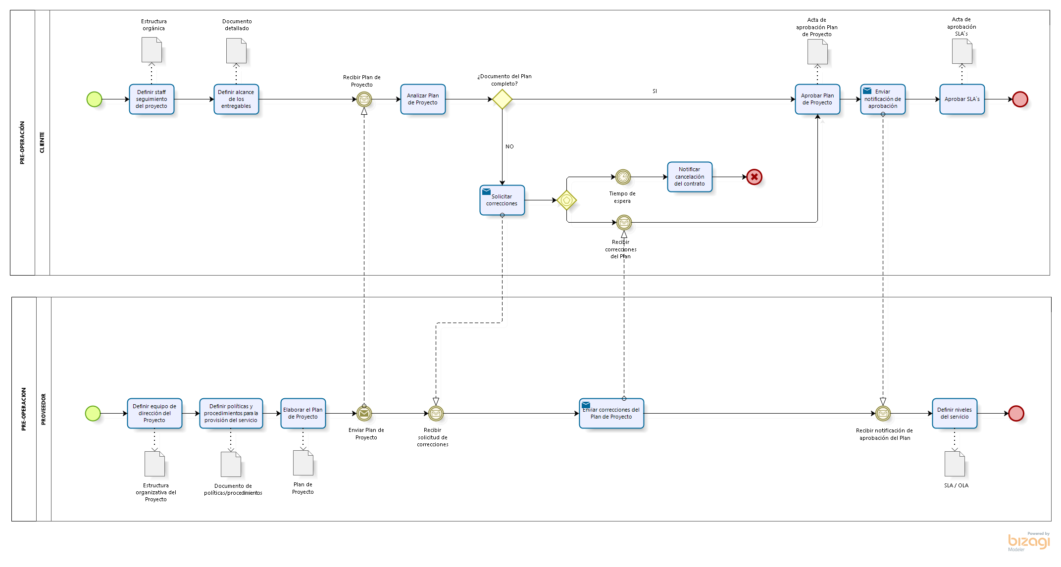 La etapa de preoperación inicia cuando se ha definido el acuerdo con el proveedor y su propósito es controlar el servicio y establecer los mecanismos para la entrega de valor al cliente mediante procesos de innovación y/o transformación. La Figura 6 representa la información de esta etapa.