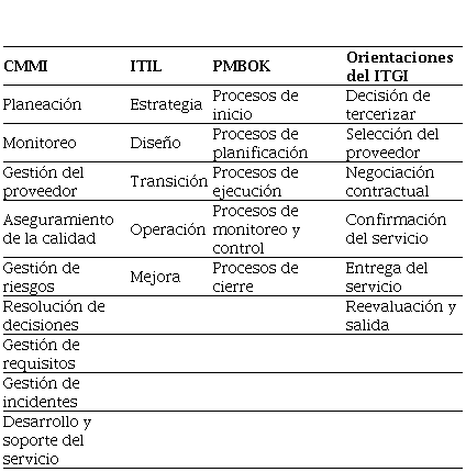 Fuente: elaboración propia.Cada uno de los marcos mencionados en la tabla anterior están orientados a proveer las mejores prácticas en gestión y gobierno de TI como apoyo a la tercerización de servicios de TI. CMMI, por ejemplo, proporciona un modelo con un enfoque en las actividades necesarias para iniciar y gestionar la adquisición/desarrollo/provisión de productos y servicios con miras a satisfacer las necesidades de los clientes y usuarios finales. Y aunque existen modelos específicos para orientar las prácticas en las tres constelaciones (CMMI-ACQ, CMMI-DEV y CMMI-SVC), de manera general provee una serie de fases para el desarrollo del ciclo de vida de proyectos de TI, que se pueden adaptar a procesos de tercerización de TI.