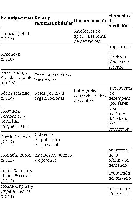 Fuente: elaboración propia.Así, el trabajo propuesto por Sáenz Marcilla (2014) es el que más se acerca al establecimiento de responsabilidades al interior de los proyectos, la generación de documentación y la definición de métricas de evaluación, pese a que su propuesta está orientada exclusivamente a la gestión de proyectos para proveedores. Otra de las posturas interesantes es la de Montaña Barón (2013), quien considera que la alta dirección debe ser el facilitador del gobierno en la organización, para generar iniciativas que garanticen la administración y el seguimiento permanente tanto de la oferta como de la demanda de servicios de TI, en todos sus niveles. Las anteriores investigaciones resultan interesantes porque proponen miradas distintas para abordar la tercerización de servicios de TI, haciendo énfasis en aspectos puntuales que deben considerarse en el gobierno y la gestión de servicios; sin embargo, no proporcionan información completa que pueda ser utilizada como modelo para implementar todo el proceso de gobierno y gestión desde la perspectiva del cliente y del proveedor.