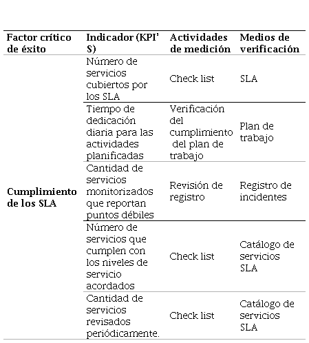 Elaboración propia a partir de Sanguino Reyes (2019).Table 4. Performance indicators for the critical success factor called “Compliance with SLAs”