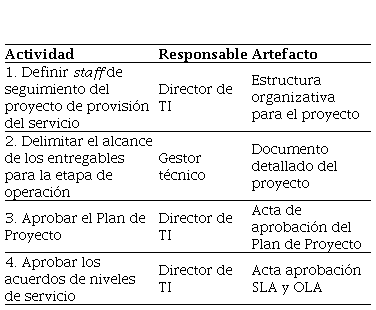 La etapa de negociación establece los requerimientos técnicos y contractuales del servicio ofrecido por el proveedor, así como el análisis de riesgos para el proyecto. La etapa de preoperación dispone la estructura organizativa para la prestación del servicio, define el plan de proyecto y los acuerdos de niveles de servicio entre ambas partes.