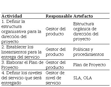 Elaboración propia a partir de Sanguino Reyes (2019).Las Tablas 5 y 6 detallan la información de esta etapa en términos de las actividades que la componen, los roles asociados a la ejecución de estas y los entregables generados, tanto para el cliente, como para el proveedor, respectivamente.