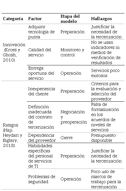Fuente: elaboración propia.Como se indica en la Tabla 7, y de acuerdo con lo planteado por Kroes y Ghosh (2010) y Haji Heydari y Biglary (2018), se establecieron dos categorías para ubicar la relación entre los hallazgos, resultado del diagnóstico realizado en las universidades públicas de Norte de Santander con las etapas del modelo propuesto y la asociación con los factores de las categorías para la tercerización de servicios de TI en universidades.
