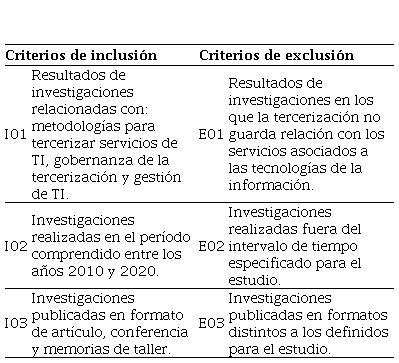 Los resultados obtenidos se generaron teniendo en cuenta los criterios de inclusión y exclusión (ver Tabla 1). La investigación permitió la búsqueda de documentos candidatos con relación a los procesos de tercerización de TI; fueron incluidos trabajos en formato de artículos, conferencias y memorias de taller, comprendidos entre los años 2010 y 2020 y se descartaron aquellos estudios en los que la tercerización no guarda relación con los servicios asociados a las tecnologías de la información.