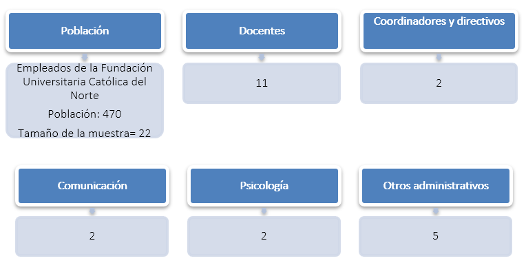 A partir de lo anterior, se procede con el desarrollo de este trabajo descriptivo de carácter mixto, el cual tuvo como objetivo identificar capacidades de innovación en el contexto de una universidad virtual. El instrumento fue aplicado en la Fundación Universitaria Católica del Norte, la cual es la primera institución universitaria virtual de Antioquia, siendo pionera en ofrecer formación superior profesional en un contexto completamente virtual. La muestra fue no probabilística discrecional, bajo la cual se logró contar con la participación de veintidós colaboradores de la institución con grado de educación profesional, es decir, todos los miembros cuentan con un título de educación superior en diferentes áreas de conocimiento, obteniendo información de estos por parte de personas con diferentes cargos como: directores, coordinadores, docentes y demás personal administrativo, como se observa en la Figura 1.