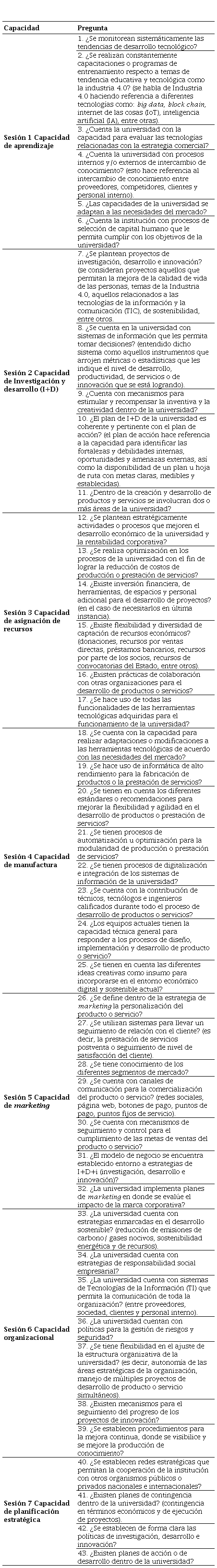 Originality: This study proposes valuable elements that enable Higher Education Institutions—who educate professionals—to respond to society’s needs and adapt to its constant changes because innovation promotes the productive and financial performance of an organization, as well as its general growth. Therefore, identifying innovation capabilities enables organizations to determine the dynamics and current context they are immersed in so that they can adopt strategies to improve themselves in terms of innovation.