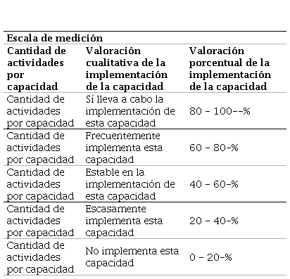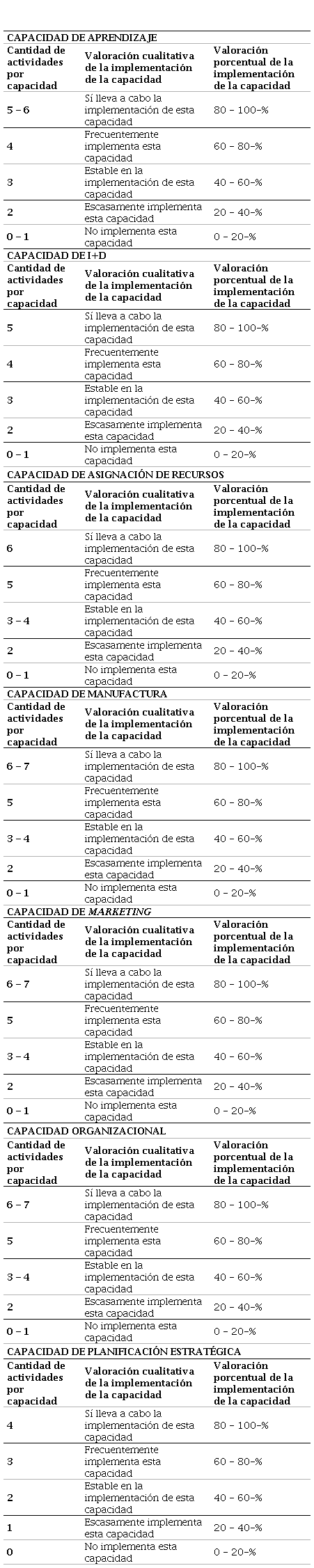 Fuente: elaboración propia basada en Macías Urrego (2014).Table 3. Rating scale for innovation capabilities based on the implementation of activities