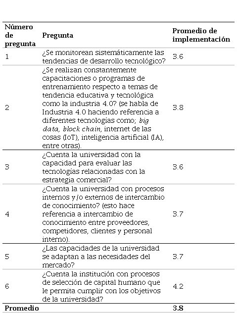 Para la capacidad de aprendizaje se evaluaron seis actividades, obteniendo un promedio de implementación de 3.8, como se puede observar en la Tabla 4. La principal actividad implementada es la selección de capital humano calificado para la organización. Lo anterior indica que la Institución lleva a cabo procesos de selección objetivos que permiten escoger personas con las competencias y habilidades adecuadas para el desarrollo de las actividades de la organización. Adicionalmente, esa actividad indica que el conocimiento es un factor relevante para la organización. La segunda actividad que más se implementa son las capacitaciones relacionadas a las tendencias tecnológicas de educación, principalmente aquellas relacionadas con la industria 4.0, reafirmando lo mencionado anteriormente, donde el conocimiento se observa como uno de los recursos más valorados por la organización, lo cual es congruente con la actividad de esta; así mismo aporta, en lo concerniente la generación de conocimiento y desarrollo creativo, aspectos importantes para la innovación.