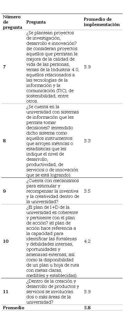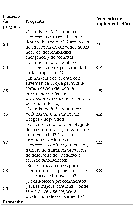 Fuente. elaboración propia en el software Excel a partir de los resultados de la encuesta.En cuanto a las actividades con menor grado de implementación, se encuentran las estrategias enmarcadas en el desarrollo sostenible, con un resultado de 3.6. Este es uno de los aspectos fundamentales en cuanto a innovación, pues es uno de los factores que cobra mayor relevancia en cuanto al dinamismo y la adaptabilidad de la organización al entorno cambiante actual y a los factores alineados con los Objetivos de Desarrollo Sostenible (ODS), los cuales son primordiales en el momento de indicar el impacto y la alineación y aceptación de resultados de innovación.
