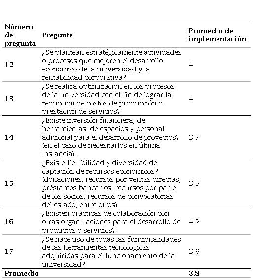 Respecto a la capacidad de asignación de recursos, se realizó la evaluación de actividades, a partir de las cuales se obtuvo un resultado de 3.8, como se puede observar en la Tabla 6. La actividad con la mayor valoración fue la colaboración con otras organizaciones para el desarrollo de productos o servicios, algo significativo en el contexto de la academia, por lo cual el resultado, si bien es bueno, sería de gran aporte para el desarrollo de la capacidad de innovación hacer un esfuerzo mayor por mejorar en este aspecto. Las siguientes actividades mejor valoradas con un resultado de 4, fueron aquellas relacionadas con la gestión de recursos económicos, donde el planteamiento estratégico de actividades que aporten al mejor rendimiento económico y a la optimización para la reducción de costos, fueron adecuadamente valoradas.