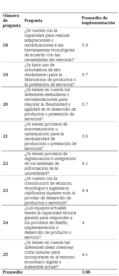 Fuente. elaboración propia en el software Excel a partir de los resultados de la encuesta.Table 7. Average implementation of activities leading to manufacturing capability