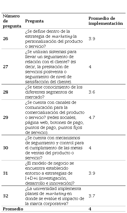 Fuente. elaboración propia en el software Excel a partir de los resultados de la encuesta.Table 8. Average implementation of activities leading to marketing capability