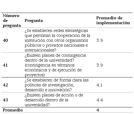 Fuente. elaboración propia en el software Excel a partir de los resultados de la encuesta.Table 10. Average implementation of activities leading to strategic planning capability