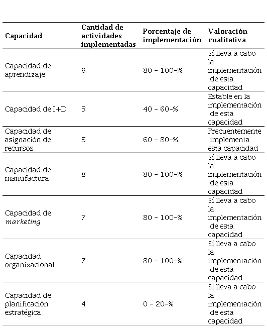 Fuente. elaboración propia en el software Excel a partir de los resultados de la encuesta.Table 11. Results of the implementation of innovation capabilities