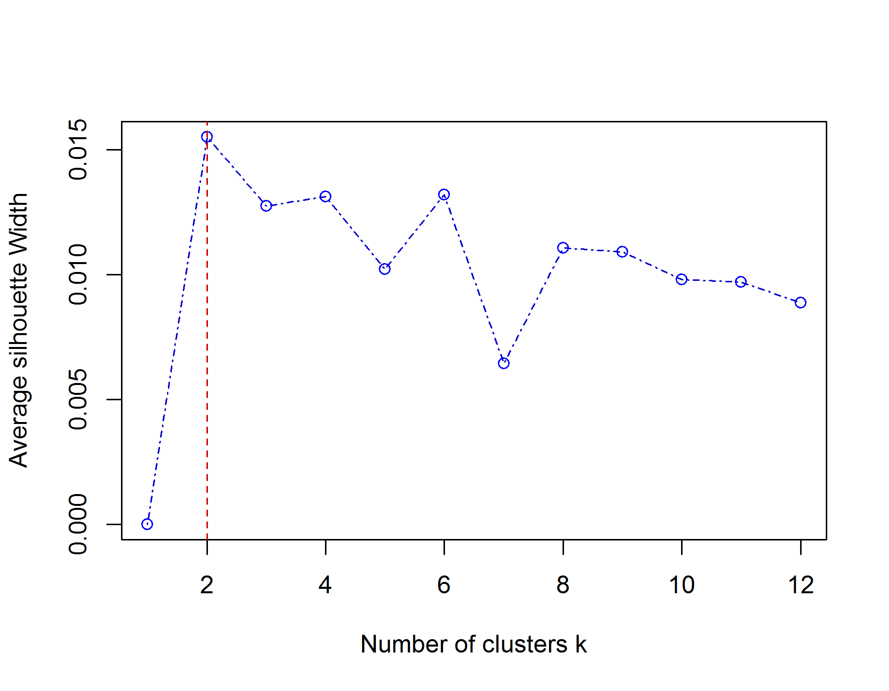 The first step to analyze the data was to calculate the optimal number of clusters that should be used according to the methodology. Figure 3 shows that the optimal number of clusters was two because it maximized the value of the average silhouette, a metric commonly used for clustering methods (Pollard & Van Der Laan, 2002). Subsequently, clustering was performed as shown in Figure 4 and taking into account the 15 that explain the factors that influence workers' motivation, i.e., Achievement, Power, Affiliation, Self-Actualization, Recognition, etc. (Toro Álvarez, 1998a).