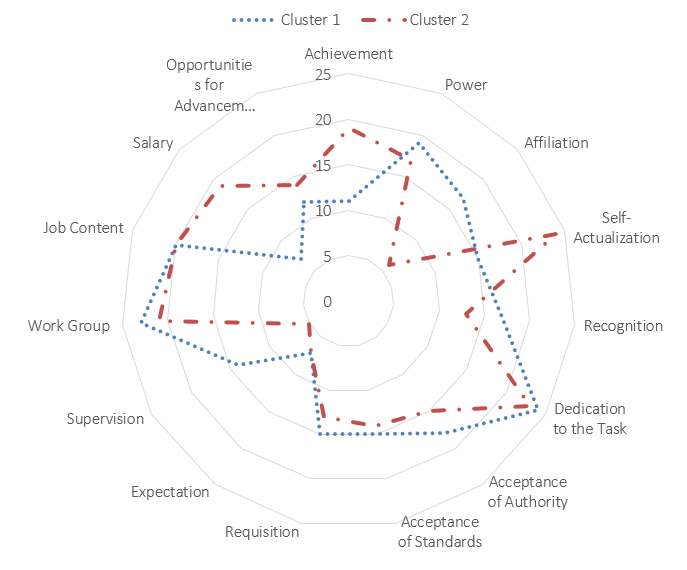 The two motivational profiles found in this Millennial population share some characteristics. During the clustering procedure, the two profiles showed similar values in several variables, such as Dedication to the Task, Job Content, and Work Group. However, their differences can be observed in other variables: Salary, Self-Actualization, and Affiliation. These results reaffirm what Pontón Deluquez and Márquez López (2016) claimed: this generation is not motivated by supervision. It was also confirmed that Millennials, a multitasking generation, are motivated by Job Content and Dedication to the Task, as proposed by Kim (2018).