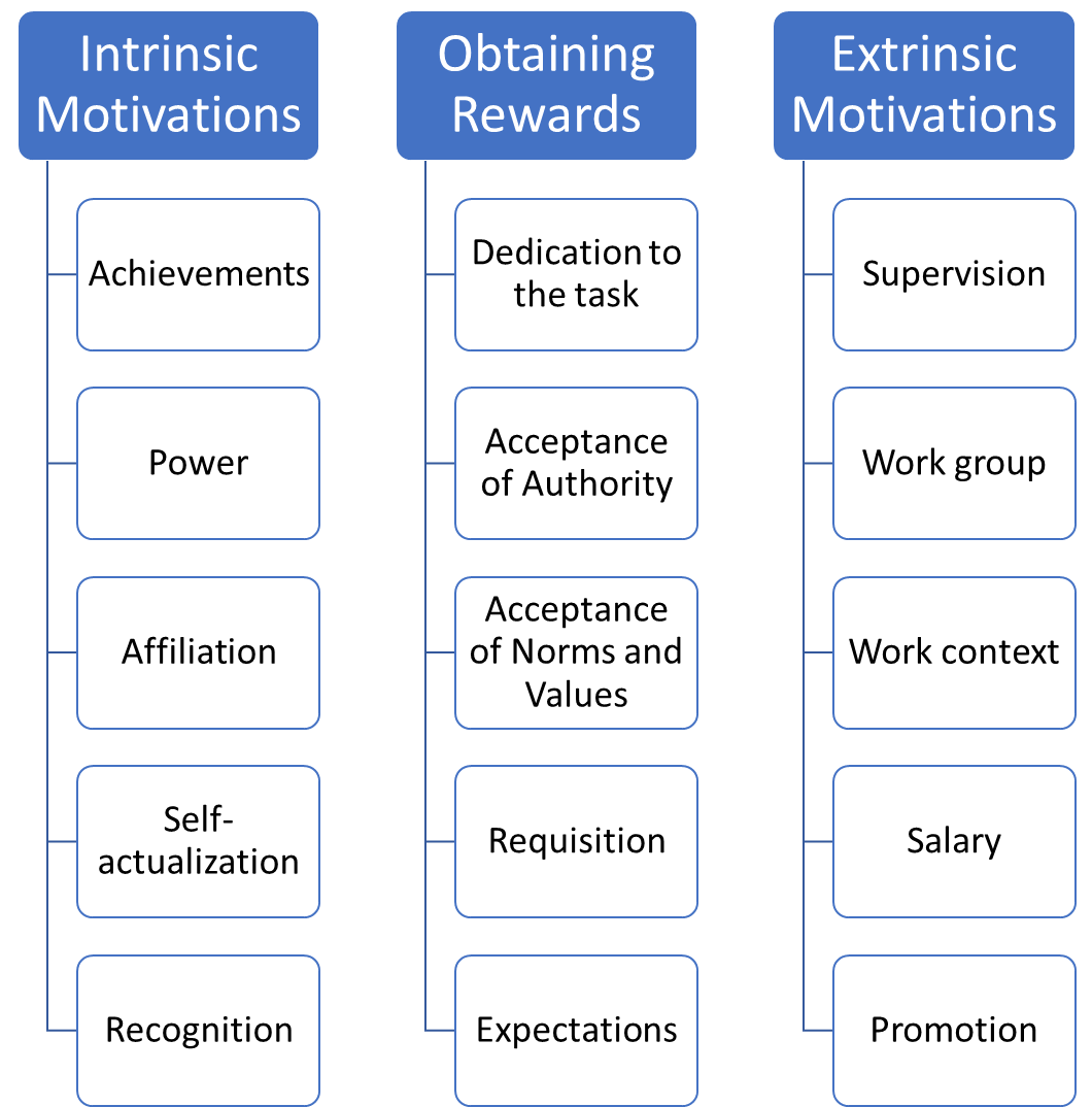 The motivational variables measured by the WMQ (Figure 2) are divided into three conceptual categories or dimensions: internal motivational conditions (intrinsic motivations), preferred means of obtaining desired rewards at work (obtaining rewards), and external motivational conditions (extrinsic motivations) (Toro Álvarez, 1998a; Toro Álvarez, 1998b). Each one of these dimensions contains five variables. Intrinsic motivations include Achievement, Power, Affiliation, Self-Actualization, and Recognition. Obtaining rewards encompasses Dedication to the Task, Acceptance of Authority and Rules, Requisition, and Expectation. Finally, extrinsic motivations are Supervision, Work Group, Job Content, Salary, and Advancement Opportunities. These three dimensions of the WMQ and their variables are detailed below.