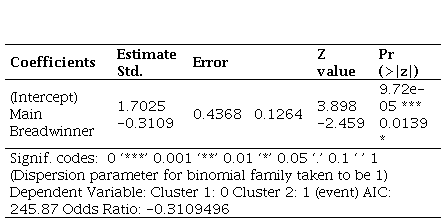 According to the information in Tables 3 and 4, Age and Main Breadwinner in the Household are driving factors that can be used to differentiate between the two clusters. In the case of Age, the older the individual, the higher his or her probability of belonging to Cluster 2. On the contrary, high values in Main Breadwinner indicate a lower probability of belonging to Cluster 2 (i.e., a high probability of belonging to Cluster 1).